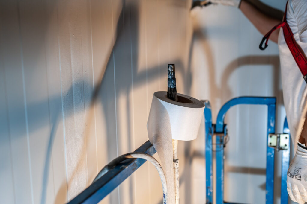 Primero, limpiamos bien las cámaras de atmosfera controlada que el espacio quedara libre de polvo. Después de esto, podríamos comenzar a aplicar CorrFill Primer DL para los paneles sándwich. Inmediatamente después, se aplica el CorrFill Primer PA a la junta del piso de concreto. Después de secar ambos imprimadores, se aplica RibbFill Control Coat con nuestro rociador sin aire. La tela CorrFill Fleece ZG se coloca en la capa húmeda de revestimiento. Después del secado, se aplica la segunda capa de RibbFill Control Coat con el rociador sin aire.