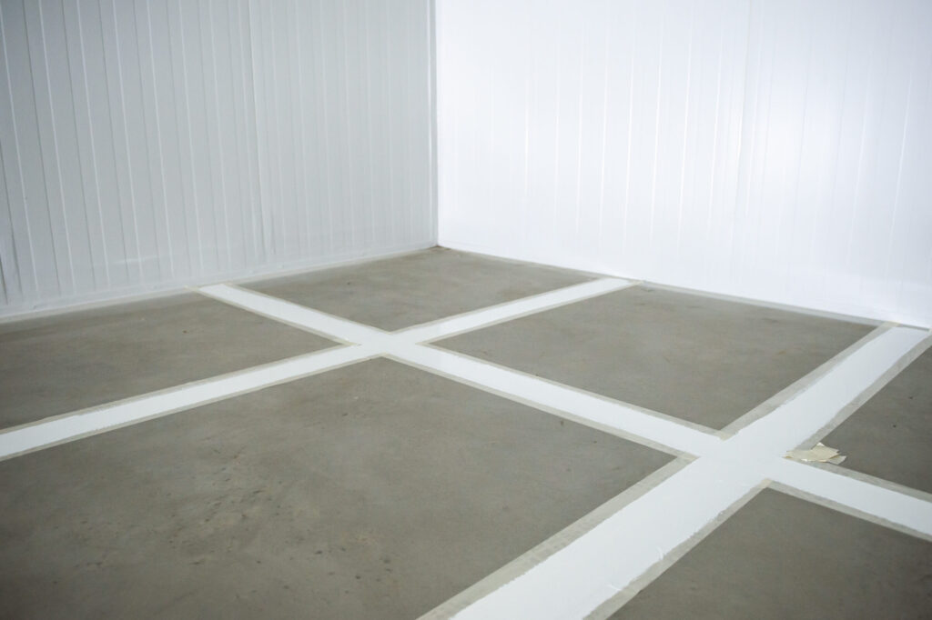También es importante que el productor de frutas tenga líneas en las celdas, de modo que las cajas y los cajones se puedan colocar de manera ordenada. Colocamos estas líneas usando un láser y un sistema de espejo. El producto utilizado para las líneas es MarrFill Floorcoat EC en el color RAL 9010.